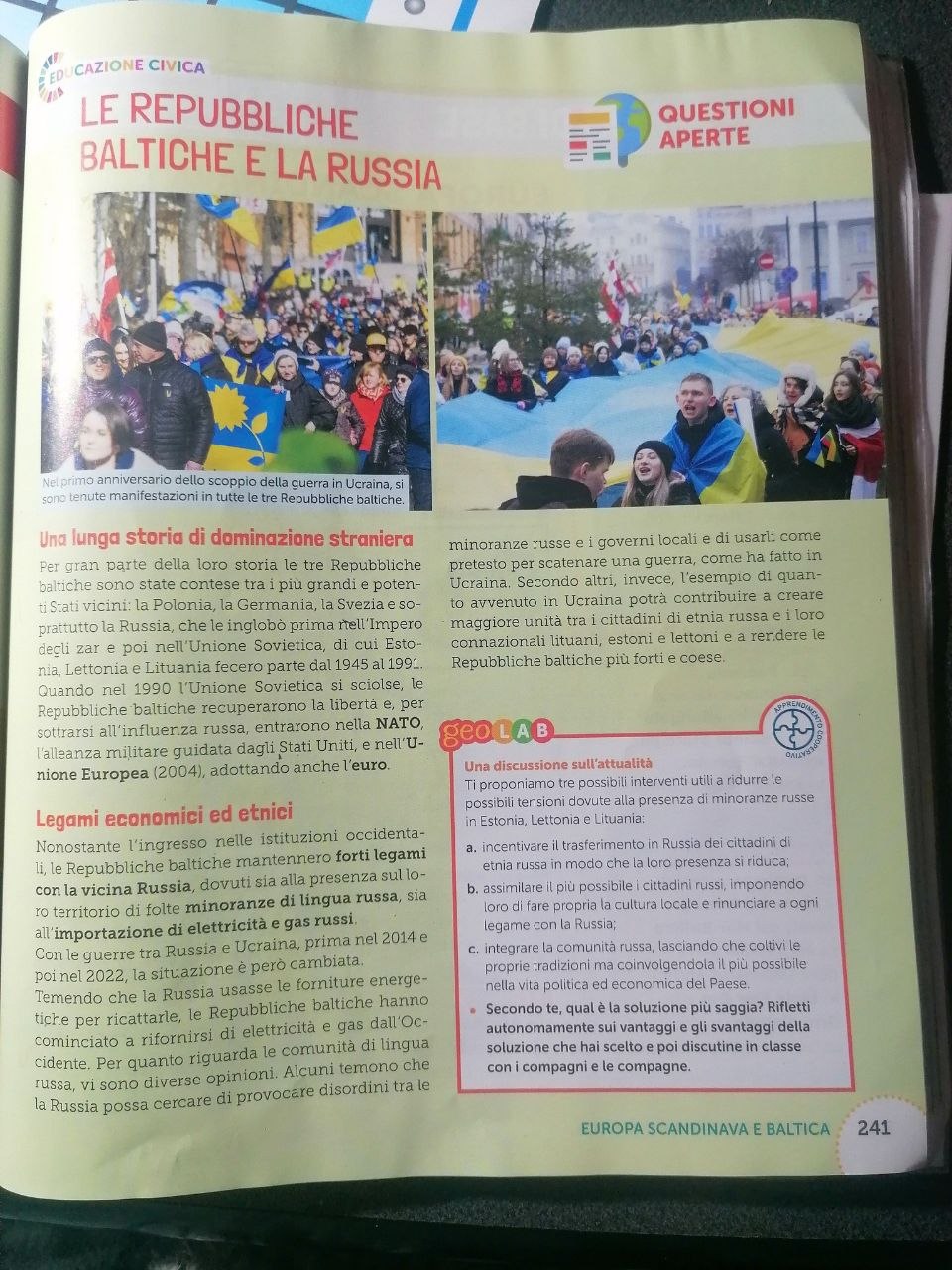 Torniamo alla pagina di educazione civica, saltiamo le solenni foto dei giovani manifestanti baltici in fermento per protestare contro quella che per loro è esclusivamente guerra unilaterale della Fed. Russia contro l’innocente Ucraina, comodamente dimentichi però dei soprusi e dei bombardamenti ai danni della popolazione del Donbass, che ha visto, secondo l’Alto Commissariato ONU per i Diritti Umani (OHCHR) e l’International Crisis Group, oltre 14.000 morti totali (circa 3.344 civili, il resto militari e paramilitari) nel periodo 2014-2022. Dopo una disamina storica delle tre repubbliche baltiche, completamente aderente all’attuale retorica ufficiale che trova la sua massima espressione nella russofobia più spinta e oltranzista al costo di darsi la vanga sui piedi, quello che più mi gela il sangue è il simpatico ed educativo (educare nell’accezione relativa allo Stato di Polizia: educare per inculcare, ovviamente) riquadro di riflessione e dibattito presente a conclusione, nell’angolo inferiore destro della pagina: “Una discussione sull’attualità”". Anche se ho riportato precedentemente il link alla foto della stessa, preferisco riportare il contenuto della sezione qui, per intero, nella sua magnificenza scolastica ed educativa: